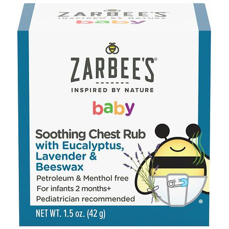 Zarbee s Baby Soothing Chest Rub is a petroleum-free chest rub for babies featuring a blend of eucalyptus & lavender oils in a beeswax & shea butter balm so you can soothe baby without harsh chemicals or toxins. Formulated for infants 2 months & older this non-irritating balm soothes gently for sensitive skin. Massage it onto the chest neck & bottom of the feet. Check out our whole line of products made of handpicked wholesome ingredients and without any drugs alcohol or artificial flavors. *These statements have not been evaluated by the Food and Drug Administration. This product is not intended to diagnose treat cure or prevent any disease.